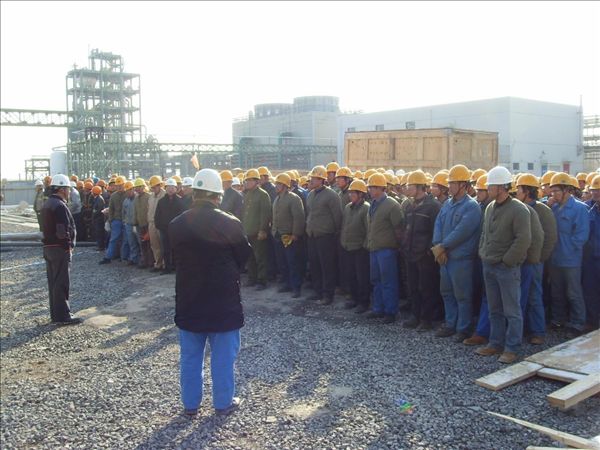 會上,分公司副經理欒立超代表分公司對干好EO裝置的重要意義進行了分析,并部署了質量安全的控制、機械材料的供應、施工技術服務等方面的工作。他號召施工人員要把項目的各項工作落到實處,做到措施落實到位、分工明確、責任到人;同時各個施工小組要認真細化任務,把任務分解到每一周、每一日,在全場形成你追我趕的大干局面。業主阿克蘇—諾貝爾乙烯胺(寧波)有限公司的現場項目經理和管理公司福斯特惠勒國際工程咨詢(上海)有限公司的現場施工經理也在會上給施工人員打氣鼓勵。