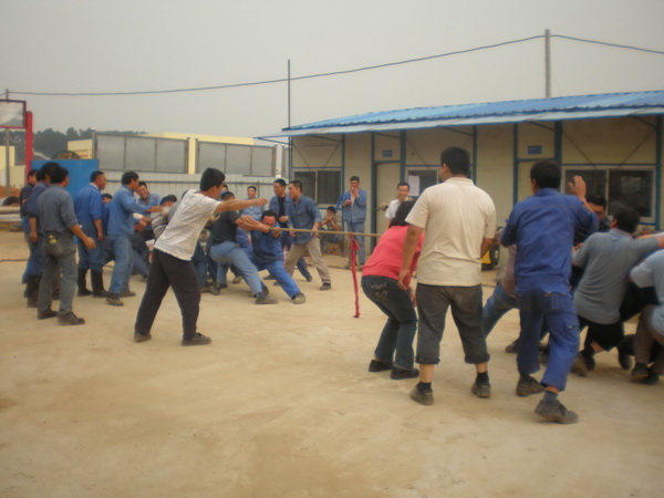 比賽在項目部辦公區內的空地上進行,共有管工班、鉗工班、電工班、綜合隊等四支隊伍參賽。參賽隊員斗志昂揚,情緒飽滿,如同臨陣的戰士。隨著裁判的一聲哨響,拔河比賽正式拉開了帷幕。一時間,人聲鼎沸,吶喊聲、助威聲隨著比賽有節奏的此起彼伏,雙方的參賽隊員均使出渾身解數、相互配合,心往一處想,勁往一處使,全身心投入到比賽中。經過激烈的角逐,在“友誼第一、比賽第二”的熱烈氣氛下,最終鉗工班奪得了桂冠。