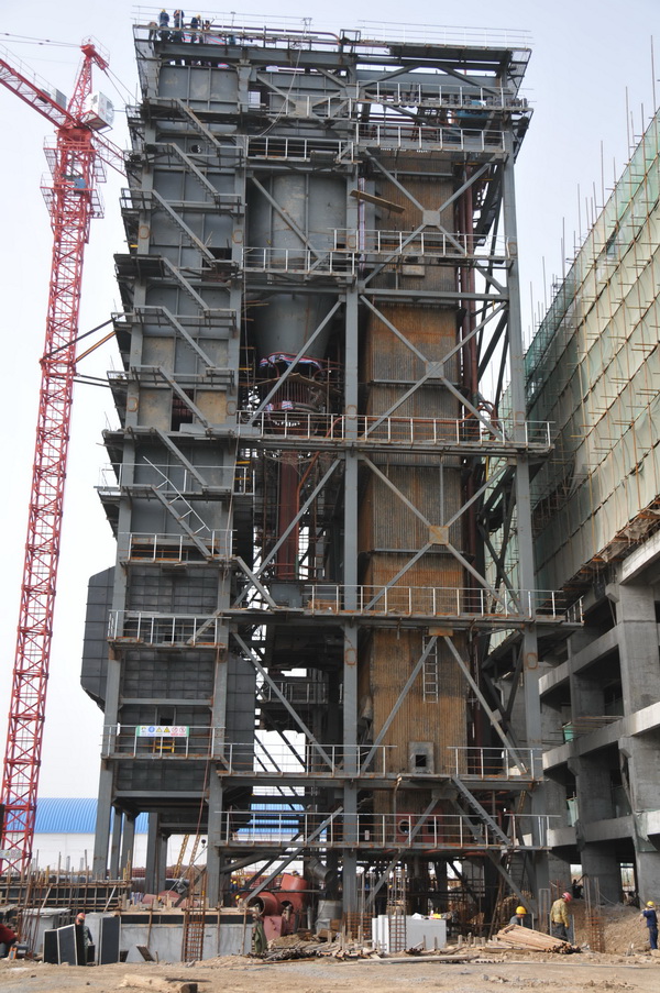 該工程為平煤集團聯合鹽化有限責任公司重點項目。130T/H硫化床鍋爐為室外布置,由前部及尾部兩個豎井煙道組成。前部豎井為懸吊結構,四壁由膜式水冷壁組成,自下而上依次為硫化床、風室、水平通道。尾部豎中采用支承結構,自上而下布置有高溫過熱器、低溫過熱器、省煤器及空氣預熱器。兩豎井之間由水冷式旋風分離器相連通,分離器下部接回送裝置返料器。燃燒室及分離器內部均設有防磨內襯,前部豎井采用敷管爐墻,外置金屬護板,由吊掛裝置承受鍋爐全部重量。鍋爐運轉層在8米層,主蒸汽管道為φ273,施工難度非常高。