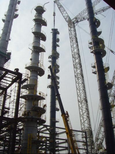 這次惠生大型設(shè)備的吊裝創(chuàng)造了目前公司吊裝史上的五個(gè)之最,即成功吊裝最高的塔(硫化氫濃縮塔高81.2m),成功吊裝最重的塔(甲醇洗滌塔重350t),使用的吊車規(guī)格最大(1250t吊車),最先采用鋼結(jié)構(gòu)模塊安裝,最大規(guī)模的一次大型設(shè)備吊裝。