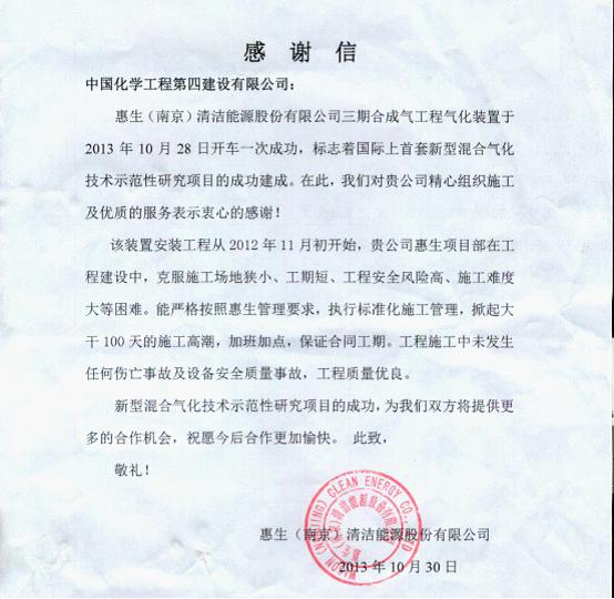 氣化裝置是繼其他各套系統(tǒng)開車成功后最后開車的核心裝置。它的成功開車標志著全部施工任務圓滿完成。分公司在該項目上創(chuàng)造了工程進度、質(zhì)量安全、業(yè)主服務三個一流,用心血和汗水為業(yè)主奉獻了精品工程,展示了化建湘軍的風采,更獲得了業(yè)主來信高度贊揚!