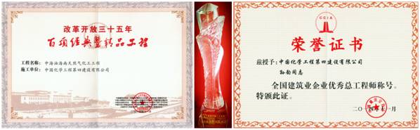 11月28日,從首都北京傳來喜訊,在中國建筑業協會組織召開的“改革開放35年百項經典暨精品工程發布及全國建筑業先進企業、優秀企業家和優秀總工程師表彰大會”上,公司作為主申報單位,協同中國化學工程集團公司等8家參與建設的“中海油海南天然氣化工工程”榮獲了“改革開放35年百項經典暨精品工程獎”,公司總工程師孫韻榮獲“全國建筑業企業優秀總工程師”榮譽稱號。