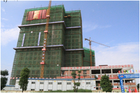 據公司四化大廈項目部現場執行經理廖華軍介紹:四化大廈項目建筑面積27720m2,分地下1層、地上20層,建筑高度92.9m。項目自2015年6月15日開工以來,在項目部施工人員的共同努力下,完成了土方工、樁基、地下室、主體結構工程, 共完成混凝土澆筑14160m3,鋼筋安裝1485噸,施工人員投入33萬工時,在各分項驗收過程中合格率達100%,優良率達90%以上,得到岳陽市政府、經開區管委會的肯定,在岳陽市文明衛生城市、國家安全監督檢查、國務院消費專項檢查、湖南省質量安全文明示范工地、建筑工程優質工地等各項檢查中均為優良,受到一致好評。