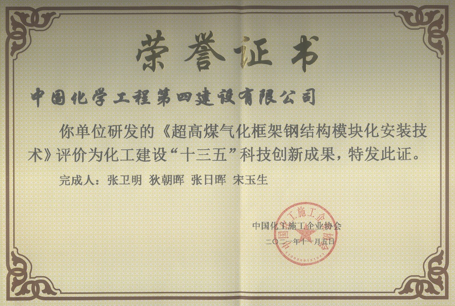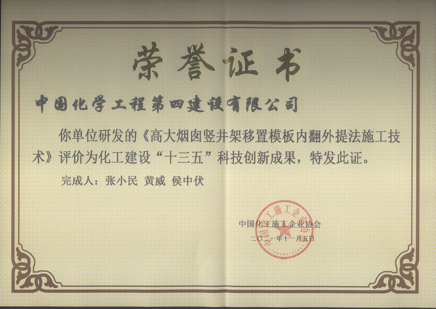 7月25日,從化工協(xié)會(huì)十屆三次會(huì)員代表大會(huì)暨科技創(chuàng)新大會(huì)傳來喜訊,公司榮獲兩項(xiàng)化工建設(shè)“十三五”科技創(chuàng)新成果獎(jiǎng),分別為華南公司完成的高大煙囪豎井架移置模板內(nèi)翻外提法施工技術(shù)和華東公司完成的超高煤氣化框架鋼結(jié)構(gòu)模塊化安裝技術(shù)。