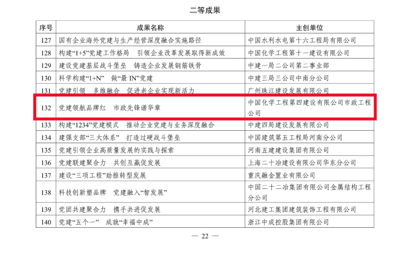 5月27日,從中國施工企業(yè)管理協(xié)會(huì)傳來喜訊,公司選送的黨建案例《黨建引領(lǐng)價(jià)值創(chuàng)造 繪就“雙百億”發(fā)展新畫卷》獲評(píng)2024年工程建設(shè)企業(yè)黨建工作一等成果,市政工程公司選送的黨建案例《黨建領(lǐng)航品牌紅 市政先鋒譜華章》和華南公司選送的黨建案例《黨建引領(lǐng)“粵向前” 融合發(fā)展譜新篇》獲評(píng)二等成果。