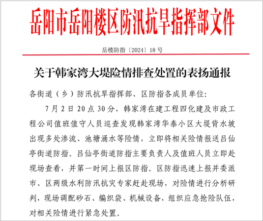 7月5日,岳陽市委常委、常務(wù)副市長李建華到項(xiàng)目現(xiàn)場(chǎng)督導(dǎo)防汛工作,對(duì)公司前段防汛工作給予充分肯定。同日,岳陽市岳陽樓區(qū)防汛抗旱指揮部發(fā)來通報(bào),對(duì)項(xiàng)目部精心組織、及時(shí)處置,確保管涌險(xiǎn)情得到有效控制予以表揚(yáng),并對(duì)喻希陽予以嘉獎(jiǎng)。