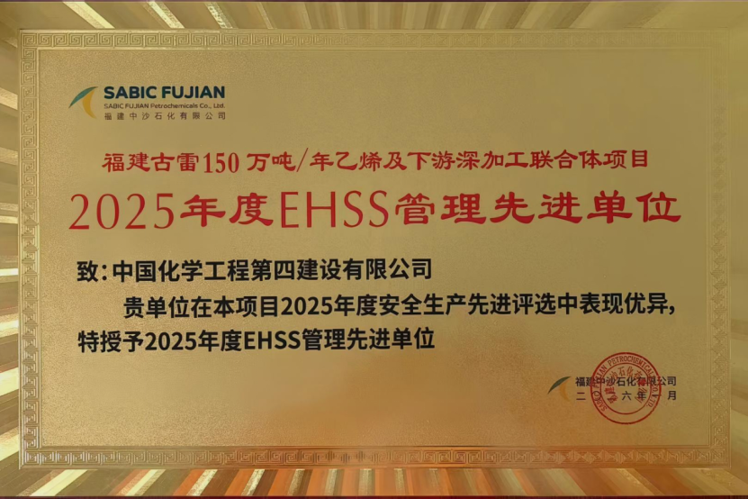 近日,從中國化學工程第四建設有限公司華南公司承建的福建古雷150萬噸/年乙烯及下游深加工聯合體項目傳來喜訊,項目成功獲評集團公司“四星級標準化工地”,同時獲業主福建中沙石化有限公司授予“2025年度EHSS管理先進單位”稱號。兩項榮譽的取得,充分展現了項目團隊在安全、質量及標準化建設方面的硬核實力。