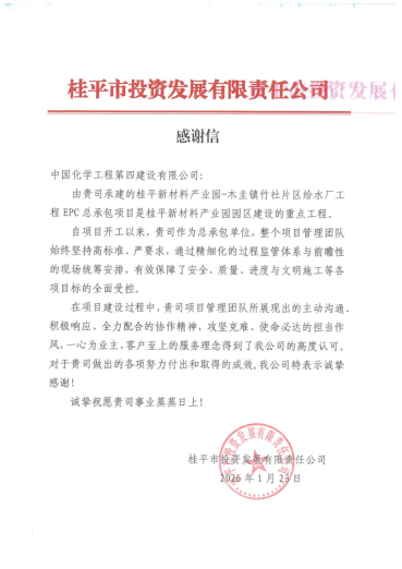 近日,公司收到桂平市投資發(fā)展有限責(zé)任公司發(fā)來的感謝信,對華南公司承建的桂平新材料產(chǎn)業(yè)園木圭鎮(zhèn)竹社片區(qū)給水廠工程EPC總承包項目給予高度評價,并對項目團(tuán)隊展現(xiàn)出的專業(yè)素養(yǎng)與擔(dān)當(dāng)精神表示衷心感謝。