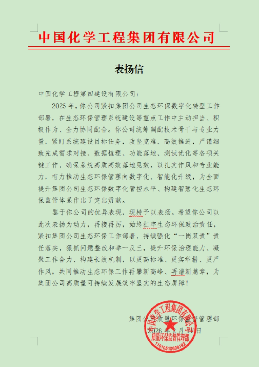近日,中國化學(xué)工程第四建設(shè)有限公司收到中國化學(xué)工程集團有限公司質(zhì)量環(huán)保監(jiān)督管理部發(fā)來的表揚信,對公司在2025年度生態(tài)環(huán)保數(shù)字化轉(zhuǎn)型工作中的積極貢獻與推進成效給予充分肯定。