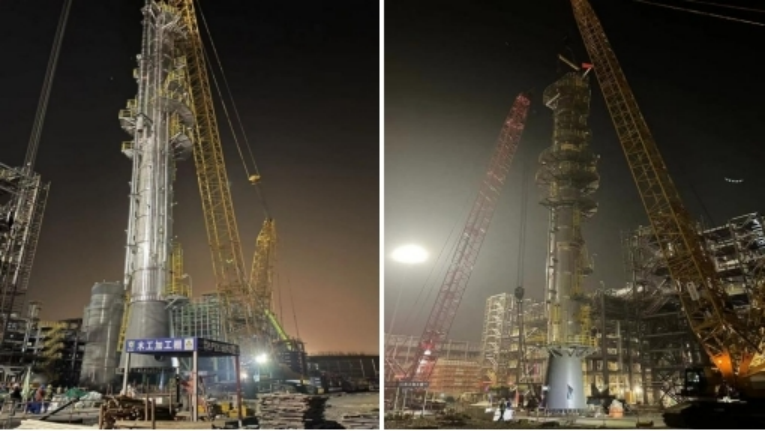 大連恒力石化項目完成苯酚丙酮裝置兩臺塔器吊裝