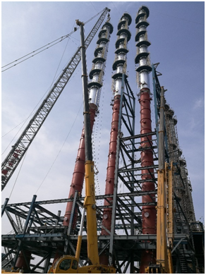 這3臺精餾塔是精餾裝置區(qū)的主要設(shè)備,塔高92.5米,是該工程中起吊高度最高,安裝難度最大,以及危險性最大的施工作業(yè)。為了確保一次順利將這3臺超高設(shè)備吊裝成功,分公司施工人員精心設(shè)計分兩段吊裝,先將3臺塔的下段依次吊裝就位并安裝完成,然后再進行上段的吊裝。在塔體上段的安裝過程中,因塔體太高,現(xiàn)場風(fēng)力、溫度等環(huán)境因素的變化會大幅度影響塔體的垂直度,項目部技術(shù)人員詳細(xì)考慮各種影響因素,密切關(guān)注現(xiàn)場環(huán)境與塔體的垂直度情況,一次準(zhǔn)確順利將這3臺超高設(shè)備吊裝就位。