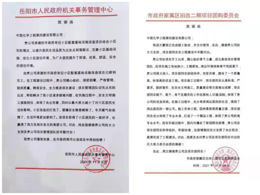 近日,建筑工程分公司和成大廈項(xiàng)目、岳陽市政府家屬區(qū)改造項(xiàng)目分別收到岳陽市政府家屬區(qū)舊改二期項(xiàng)目團(tuán)購委員會(huì)、岳陽市人民政府機(jī)關(guān)事務(wù)管理中心送來的兩封致謝函。