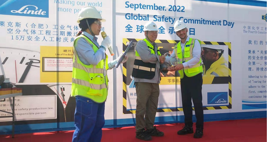 9月19日下午,華東公司普萊克斯(合肥)工業氣體有限公司空分氣體工程二期搬遷項目在現場舉行15萬安全工時慶典業主林德亞太區總監羅伯特出席慶典