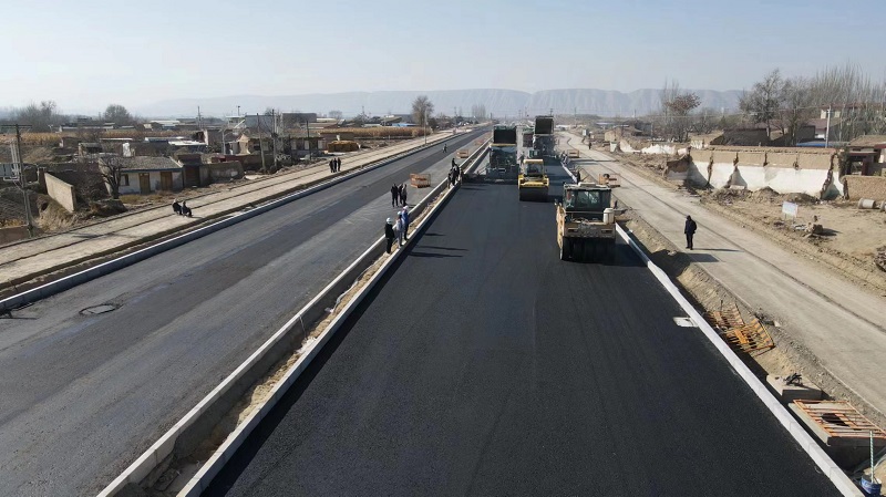 11月22日上午,在西部公司蘭州榆中項目夏緯七路二期施工現場,作業車輛機器轟鳴,正在進行K2+600-K3+120段中下面層瀝青攤鋪作業,施工現場多臺大型運輸車、壓路機和瀝青攤鋪機井然有序排開,伴隨著轟鳴的機械聲,一條黑色的瀝青路面在工人身后延伸,標志著該項目施工進展進入新階段。